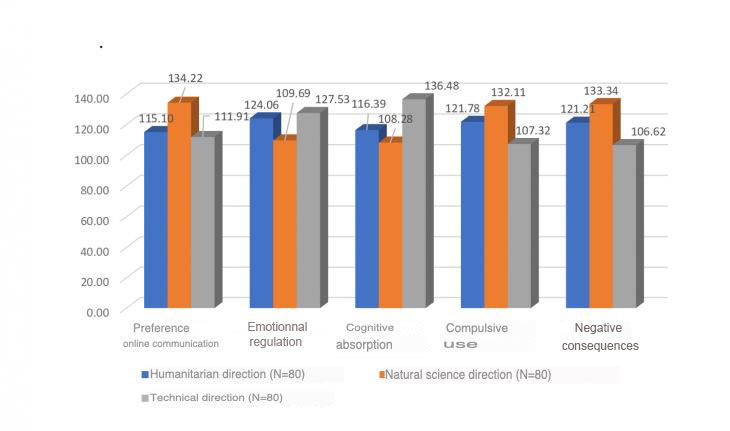 Due to the fact that students spend a lot of time in the virtual world, the question arises about the safety of communicative network activity. The most important security tasks are the protection of personal data, the ability to build virtual relationships, avoid inciting conflicts, and be aware of the negative consequences of being online. Accordingly, mastering the skills of digital competence by students is a priority task. The results of the study by A. S. Volkova and M. M. Kudaeva of digital literacy among students of non-digital areas of professional training showed that the inclusion of media literacy programs in the educational process is necessary [8]. Other scientists who conducted research on digital skills in students came to similar conclusions [11]. Methodology and methods of research The article presents an analysis of theoretical and empirical research of students' communicative network activity. The object of this study is the communicative network activity of students. The subject of the study is the differences in the communicative network activity of students of different areas of professional training. The purpose of this study is to identify differences in communicative network activity among students of different areas of professional training. The methodological basis of the study was the subjective-personal approach (A. G. Asmolov, V. N. Myasishchev). An empirical study was conducted on the basis of RUDN, MIIT, KemSU, MSU, RNIMU named after N.I. Pirogov. The sample size was 240 respondents (120 boys and 120 girls), aged 17 to 23, average age 20.3 years. Respondents of the following areas of professional training: natural science (80 people), humanities (80 people), technical (80 people). Data collection took place in the period from November 2021 to March 2023 and was carried out using software Microsoft Forms. Methods of statistical processing included: H is the Kruskal-Wallis criterion, U is the Mann-Whitney criterion. The following methods were used in the work: - "Questionnaire of problematic use of social networks" (N.A. Sirota, D.V. Moskovchenko, V.M. Yaltonsky, A.V. Yaltonskaya) [16]. The use of the Questionnaire made it possible to study the behavior of students in the conditions of communication of social networks, as well as to identify problematic trends in their use, through the scales: "Preference for online communication", "Emotion regulation", "Compulsive behavior", "Cognitive absorption", "Negative consequences"; - "Methodology for assessing involvement in the use of information and communication technologies" (A.N. Tatarko, E.V. Maklasova, Z.H. Lepshokova, etc.) [15]. The methodology is used to analyze the trends of students' involvement in the inclusion of electronic technologies in their life through scales: "Communication in social networks", "Economic actions on the Internet", "Smartphone use" and "A variety of areas of ICT use". Results of an empirical study Figure 1 shows the results of a comparative analysis using H-Kruskal-Wallis criterion of the data of the methodology "Problematic use of social networks" in students of different areas of professional training. Statistically significant differences were found on the scales: "Cognitive absorption" in the natural science direction - 108.28, humanitarian – 116.39, technical – 136.48 (H=7,064, p=0.029); "Negative consequences" in students of the natural science direction – 106.62, humanitarian - 121.21, technical – 133.34 (H=7,065, p=0.029). Students of the technical direction have cognitive absorption, uncontrolled mental return to the virtual world, respectively, this leads to difficulties in planning Internet time. Respondents of the technical direction are aware of the risks and negative consequences due to excessive stay in the virtual world. Such consequences include social isolation, deterioration of the quality of life and the emergence of problems in the real world. The least pronounced cognitive absorption and the appearance of negative consequences of Internet visits among students of the natural science direction. It can be assumed that the professional orientation of students' training has an impact on Internet behavior due to differences in methods and approaches, areas of knowledge, and professional specialization. The analysis of the following scales did not show statistically significant differences: "Compulsive use" in students of natural science - 107.32, humanities - 121.76, technical – 132.11 (H=5.163, p=0.076); "Emotion regulation" in students of natural science – 109.66, humanities - 124.06, technical – 127.53 (N=2.076, p=0.226); "Preference for online communication" of the natural science direction - 111.91, humanitarian – 115.10, technical – 134.22 (N=4.892, p=0.087). Based on the data obtained, it can be concluded that students have similar tendencies on the Internet in terms of compulsive use, visiting the virtual world in order to raise their emotional mood and preferences for online communication.  Figure 1. Comparative analysis of the problematic use of social networks among students of different areas of professional training Figure 1. Comparative analysis of problematic use of social networks among students of different areas of professional training Next, we will consider the results of a comparative analysis using the Mann-Whitney U-test in relation to the problematic use of social networks on the basis of gender in students of different areas of vocational training (Table 1). Differences were found in students of the humanities (U=693,500, p=0.057) and technical (H=649,000, p=0.053)directions on the scale of "Emotion regulation". Girls of both directions choose to cope with the feeling of loneliness, raise their emotional mood, improve their emotional state, with the help of virtual communication. Differences were found on the scales of "Cognitive absorption" (U=412,500, p=0.000) and "Negative consequences" (U=481,000, p=0.003) in student