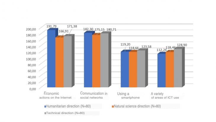 Let's move on to a comparative analysis of the results in the areas of professional training of students "Methods for assessing student involvement in the use of ICT" using The Kruskal-Wallis H-test (Fig. 2). Statistically significant differences were found in students on the scales: "Diversity of ICT use areas" natural science - 118.44, humanities – 112.24, technical – 128.9 (H=2.340, p=0.053). "Economic actions" natural-scientific direction -166.91, humanitarian – 191.79, technical – 171.38 (H=2.178, p=0.055). Students of the technical direction use electronic technologies in a more diverse way, most likely this is due to the professional orientation of the field of knowledge and its practical application. Humanities students use technology in a less diverse way. At the same time, the humanitarian areas of training are inherent in performing economic actions in the virtual world, such as making various payments, buying and purchasing goods and services, using applications, Internet platforms and services for economic purposes, etc. When analyzing the following scales, no statistically significant differences were revealed: "Smartphone use" natural science direction - 118.66, humanitarian - 119.20, technical – 123.58 (H=0.407, p=0.816); "Communication in social networks" natural science direction - 175.15, humanitarian - 182.30, technical – 180.71 (H=0.318, p=0.853). General trends in the student sample are observed in relation to the use of a smartphone and being in social networks for the purpose of communication.  Figure 2. Comparative analysis of the assessment of involvement in the use of ICT among students of different areas of professional training Figure 2. Comparative analysis of assessment of involvement in the use of ICT among students of different areas of professional training Table 2 presents a comparative analysis on the basis of gender among students of different areas of professional training. Differences were found in young men of the humanitarian direction on the scale of "Economic actions on the Internet" (U=429,000, p=0.000). Young men are more likely to purchase goods and services in the virtual world, use applications and other resources. Girls of technical training choose communication in social networks more often than boys of the same direction (scale "Communication in social networks" U=595,500, p=0.052). Also, tech girls tend to use a smartphone more often than boys ("Smartphone use" U=609,500, p=0.026). Table 2. Gender differences of students in the involvement of the use of electronic technologies Table 2. Gender differences among students in involvement in the use of electronic technologies | ¹ | The direction of professional training of students | Number of students(N) | Average ranks | Asymptote. meaning | The value of the Mann-Whitney U-test | | Girls (N=40) | Young men (N=40) | | The scale of "Economic actions on the Internet" | | 1 | Humanitarian | 80 | 31,23 | 49,78 | 0,000 | 429,000 | | 2 | Technical | 80 | 37,13 | 43,09 | 0,245 | 661,500 | | 3 | Natural science | 80 | 41,70 | 40,29 | 0,787 | 791,500 | | Scale "Communication in social networks" | | 4 | Humanitarian | 80 | 38,60 | 42,40 | 0,440 | 724,000 | | 5 | Technical | 80 | 45,18 | 34,82 | 0,052 | 595,500 | | 6 | Natural science | 80 | 41,24 | 40,88 | 0,962 | 815,000 | | The "Smartphone Usage" scale | | 7 | Humanitarian | 80 | 42,18 | 38,83 | 0,387 | 744,000 | | 8 | Technical | 80 | 44,13 | 35,54 | 0,026 | 609,500 | | 9 | Natural science | 80 | 41,20 | 40,80 | 0,936 | 812,000 | | The scale "Diversity of ICT use areas" | | 10 | Humanitarian | 80 | 38,41 | 42,69 | 0,420 | 716,500 | | 11 |