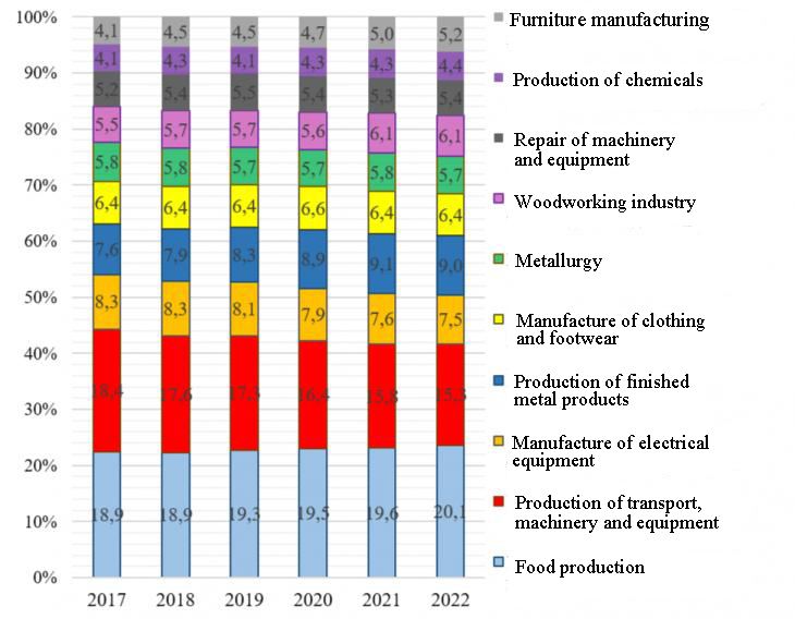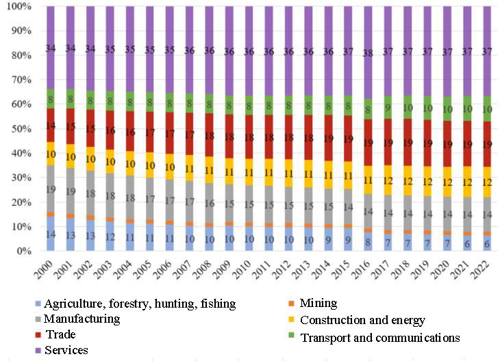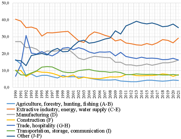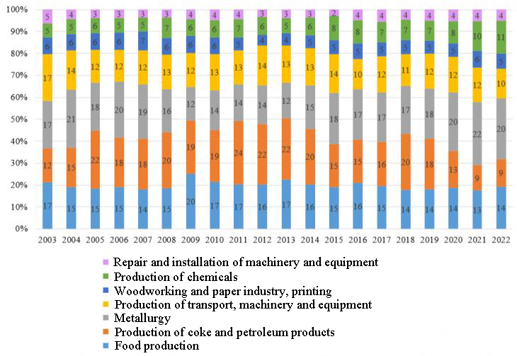 The results of the conducted research During the period under review, the sectoral structure of the gross value added of the Russian Federation has changed significantly (Fig. 1). The main trends are a significant decrease in the share of agriculture from 16.5% in 1990 to 4.2% in 2021, mining and energy from 40.4% to 29.3%, manufacturing from 27.1% to 16.3%.  Fig. 1. The sectoral structure of the gross value added of the Russian Federation, in %. (Source: compiled by the author according to the UNIDO statistical data portal, URL:https://stat. unido.org/SDG/RUS. Also, during the period under review, the share of construction decreased from 10% to 7.6%. At the same time, there is a significant growth in the trade, hotels and catering sector from 6.6% in 1990 to 16.2% in 2021, a huge growth in the service sector from 16.2% to 35.4%. These trends reflect the structural restructuring of the Russian economy that took place after the collapse of the USSR, as well as changes in the state economic and international the policy of the Russian Federation. A graphical interpretation of the dynamics of the sectoral structure shows that the primary structural shifts occurred in the economy in the period 1991-1992 and up to 1995. During this period, there was an initial decline in the share of industrial production and agriculture, construction and the public services sector in value added with peak trade growth. In 1995, the share of trade in the value added structure exceeded that of manufacturing. Until 2002-2003, the trends were deepening, and in the sectoral structure of gross value added, the share of the service sector exceeded the share of the extractive industry. Since 2008, the share of the service sector has been predominant in the structure of gross value added of the Russian economy. By 2021, the sectoral structure of gross value added is dominated by the service sector (35.4%) and the extractive industry (29.3%), manufacturing (16.3%) and trade (16.2%) are in third place, agriculture has the minimum share (4.2%). Thus, the economic and political transformations that took place during the period under review led to a fundamental change in the sectoral structure of the gross value added of the Russian Federation. Figure 2 shows the dynamics of seven enlarged manufacturing industries, which create from 82% in 2003 to 74% in 2022 of the gross value added of the Russian Federation.  Fig. 2. Dynamics of the sectoral structure of the gross value added of the Russian Federation, %. Source: compiled by the author according to the SNA, Federal State Statistics Service, URL: [https://rosstat.gov.ru/statistics/accounts ]. In 2003, more than 60% of the value added structure was produced in the following industries: food production (17%), metallurgy (17%), machine-building and instrument-making production (17%), production of coke and petroleum products (12%). Over the past two decades, the share in the structure of metallurgical production has "expanded" from 17% in 2003 to 20% in 2022 and chemical production from 5% to 11%. Food production (from 17% to 14%), production of coke and petroleum products from 12% to 9%, production of motor vehicles, machinery and equipment from 17% to 10% underwent a "compression" of the share in the structure. Figure 3 shows the sectoral structure of employment in the main enlarged sectors of the Russian economy.  Fig. 3. Dynamics of the sectoral structure of employment in the Russian Federation, in %. (Source: calculated by the author according to EMISS data, URL:https://www.fedstat.ru/indicator/58994. During the period under review, the share of employment in manufacturing decreased from 19% in 2000 to 14% in 2022 and in agriculture from 14% to 6%. The share in the employment structure of the construction industry and energy sector is increasing from 10% in 2000 to 12%, in the transport and communications sectors from 8% to 10%, in trade from 14% to 19%, and in the services sector from 34% to 37%. The following trends are observed in the sectoral structure of manufacturing industry employment (Fig. 4).  Fig. 4. Sectoral structure of employment in the manufacturing industry of the Russian Federation, %. Source: calculated by the author according to EMISS data, URL: https://www.fedstat.ru/indicator/58994 . More than 58% of the employed personnel are concentrated in the four largest industries: food, engineering, electrical equipment and finished metal products. Over the period from 2017 to 2022, the share in the sectoral structure of employment in the food industry increased from 18.9% to 20.1%, in the production of finished metal products from 7.6% to 9%, the woodworking and paper industry from 5.5% to 6.1% and the manufacture of furniture and other products from 4.1% to 5.2%. The share of chemical production employment increased from 4.1% to 4.4%. The share of employment in the production of transport, machinery and equipment is significantly decreasing from 18.4% to 15.3%, as well as in the production of electrical and electronic equipment from 8.3% to 7.5%. The share of metallurgical production in the employment structure (5.7-5.8%), repair and installation of equipment (5.2-5.4%) did not change significantly. The dynamics of the sectoral structure of exports is shown in Figure 5. More than 77% of export revenues of the Russian economy are generated by four main sectors of production: