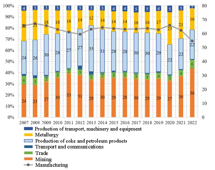 -mining: 23-36%; - production of coke and petroleum products: 22-35%; - metallurgy and production of finished metal products: 12-23%.  Fig. 5. The sectoral structure of exports of the Russian Federation, in %. Source: a list of authors according to the EMISS data, URL:https://www.fedstat.ru/indicator/58575. During the period under review, the share of metallurgical production in the export structure decreased from 22% in 2007 to 16% in 2022, and the production of coke and petroleum products from 24% to 22%. The share in the sectoral structure of exports in the manufacturing industry as a whole decreased from 67% in 2007 to 55% in 2022, which is caused by the current geopolitical situation and sanctions policy against Russian products on international markets. At the same time, this contributed to a noticeable increase in the share of mining in the sectoral structure, which increased from 24% in 2007 to 36% in 2022. The share of machine-building production in the export structure is small (3-5%), during the period under review it also decreased from 4% in 2003 to 2% in 2022 G. Table 2 shows the main calculated chain and basic (last column) indicators of structural shifts in the industry structure in terms of gross value added, employment and export volume. According to the table, it can be concluded that the most significant changes affected the sectoral structure of gross value added: the basic coefficient of absolute structural shifts was 3.189, while the average relative increase in specific gravity was 4.89%, and the value of the integral index (according to V. Ryabtsev) was 0.718, which indicates that changes in the structure of the aggregate are significant and they are close to the maximum values. This confirms the conclusions about the change in the sectoral structure of gross value added in favor of a decrease in the share of the extractive and industrial sectors in the economy with an increase in the share of the service sector in the Russian economy over the period under review. Table 2. Indicators of structural shifts in the Russian economy 2008-2022. | Indicator | 2008 | 2012 | 2016 | 2020 | 2021 | 2022 | 2022/2003 | | By gross value added | |