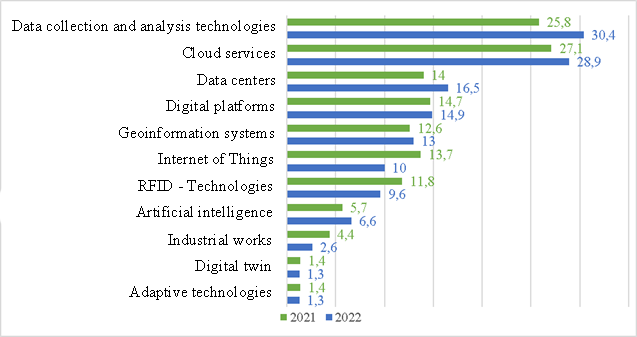 Introduction The rapid development and introduction of digital technologies in recent years has significantly changed the appearance of key sectors of the state's economy and the social sphere [1]. Every year, an increasing number of companies are striving to introduce digital solutions into their production process, thereby trying to increase its efficiency. New types of entrepreneurial activities are emerging and rapidly developing, including: e-commerce, blogging, mining, IT development (including in the field of artificial intelligence), robotics, provision of cloud services and others. A global barrier-free digital market of goods (products) and services is being formed in which those companies that are able to process and analyze a large amount of data have a competitive advantage. According to a study conducted by the Institute for Statistical Research and Economics of Knowledge of the Higher School of Economics, published in October 2023 [2], the main trends in digital business transformation, which are used by about 30% of the total number of large and medium-sized organizations, are technologies that allow collecting and processing big data, as well as various cloud services. The detailed result of the analysis is shown in Figure No. 1.  Figure No. 1. The use of digital technologies by large and medium-sized organizations (as a percentage of the total number of organizations). Source: compiled by the author on the basis of [2] As can be seen from the above data, the share of companies using digital technologies, including cloud services, is increasing. This trend is due to the following factors: - reducing the cost of developing your own digital infrastructure; - high data security; - the ability to gain competitive advantages through big data analysis; - reduction of production costs by automating processes; - increase in production volumes by reducing the production cycle; - access to information at any time and from any place; - improving the effectiveness of management decisions by obtaining accurate and systematic information; - other (depending on the specifics of the company's activities). In addition, the financial market is also changing, new means of payment are emerging: cryptocurrencies and various digital financial assets. According to TrendingView services, as of May 1, 2024, the capitalization of the cryptocurrency market amounted to 2.2 trillion US dollars[3]. The described process of introducing digital technologies is called Digital Transformation. If we define this process in more detail, then digital transformation is understood as the process of introducing digital technologies by an organization, accompanied by optimization of the control system of the main technological processes [4]. The public sector is also not on the sidelines. More and more government agencies are introducing digital solutions into the management process. Specialized computing centers for data processing are being created, as well as electronic services for interacting with citizens, and artificial intelligence technology is beginning to be actively used.