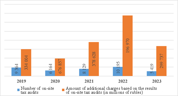| | "Transparent business" | 851.4 million requests | | "Information about legal entities and sole proprietors in respect of which documents for state registration are submitted" | 948.8 million requests | | "Provision of information from the Unified State Register of Legal Entities/EGRIP" | 602.2 million requests | Source: compiled by the author on the basis of [12]. It should also be noted that the Federal Tax Service of Russia is actively introducing innovative services, for example, the "Chatbot of the Federal Tax Service of Russia", which allows taxpayers to receive clarification on issues of interest, without direct interaction with the tax inspector. According to the above-mentioned report, the Chatbot of the Federal Tax Service of Russia answered 3.3 million user questions in 2023. Also, based on law enforcement practice, it can be concluded that the client-centricity of tax authorities is expressed in the development of a control and analytical function aimed at reducing the number of tax audits (Figure No. 3) and preventing a tax dispute by settling it at the pre-trial stage (Figure No. 4).  Figure No. 3. Dynamics of indicators of on-site tax audits conducted in the Russian Federation for the period 2019-2023. Source: compiled by the author on the basis of reports of the 2nd Tax Code of the Federal Tax Service of Russia. As can be seen from the data presented in Figure 3, the number of tax audits was significantly reduced in 2023 compared to 2019. At the same time, the growth trend in the number of on-site tax audits for the period 2020-2022 is associated with the Covid-19 pandemic and current restrictions at the beginning of the analyzed period.  Figure No. 4. Dynamics of tax disputes considered by the courts of first instance in the Russian Federation for the period 2017-2022. Source: compiled by the author on the basis of [13]