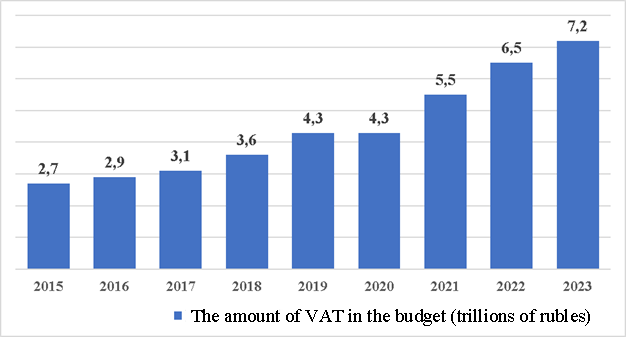The above statistics demonstrate a reduction in the number of disputes between taxpayers and tax authorities, which indicates the effectiveness of work on their pre-trial settlement. In addition, the number of claims being satisfied is decreasing, which also indirectly indicates the effectiveness of the work of tax authorities in this direction, since the number of justified objections of taxpayers to the actions of tax authorities is actually decreasing. The noted result in the form of reducing tax audits and improving the quality of services provided was achieved primarily due to the digitalization of tax administration, namely the development of an appropriate digital analytical system, called AIS "Tax-3" [14]. This system is a unified information system of the Federal Tax Service of Russia, which provides automation of the activities of the Federal Tax Service of Russia for all functions defined by the Regulation on the Federal Tax Service, approved by Decree of the Government of the Russian Federation dated 30.09.2004 No. 506, including reception, processing, provision of data and analysis of information, formation of information resources of tax authorities, statistical data, information necessary to provide support for managerial decision-making in the sphere of authority of the Federal Tax Service of Russia and the provision of information to external consumers[15]. As a result of the introduction of this information system, the tax authorities have become one of the main aggregates of information on various aspects of the financial and economic life of taxpayers, as well as other information received by the Federal Tax Service of Russia (for example, the registry Office registry Office). Let's look at some of the systems operating on the basis of AIS "Tax-3". The most well-known subsystem of AIS "Tax-3" is the Automated control system "VAT-2" (ASK VAT-2), based on a mirror comparison of books of purchases and sales of declarations of counterparties. In addition, the system automatically allows you to determine the risk level of each of the tax returns, as well as, if signs of an illegal tax avoidance scheme are detected, determine the intended beneficiary. This system revolutionized VAT administration in the Russian Federation and allowed the tax authorities to significantly improve the quality of control over the payment of this tax by taxpayers, which led to a significant increase in VAT revenues to the budget (Figure No. 5).  Figure No. 5. Dynamics of VAT receipts to the budget of the Russian Federation for the period 2015-2023 Source: compiled by the author on the basis of data from the report of the 1st Federal Tax Service of Russia. In addition, an important achievement from the introduction of the VAT-2 Automated Control System was a change in the business model of taxpayers, including a reduction in tax avoidance schemes used by them, as evidenced by such an indicator as "The share of VAT discrepancies in the total amount of VAT tax deductions (Figure No. 6). This result was made possible thanks to automated control over all transactions reflected in taxpayers' tax returns and increased overall transparency of their financial and economic activities. As a result, the likelihood of unscrupulous taxpayers concealing dubious transactions has significantly decreased, which has led to the need to conduct business within the legal framework.  Figure No. 6. Dynamics of VAT discrepancies in the total amount of VAT tax deductions for the period 2015-2023. Compiled by the author on the basis of data from the analytical port of the Federal Tax Service of Russia