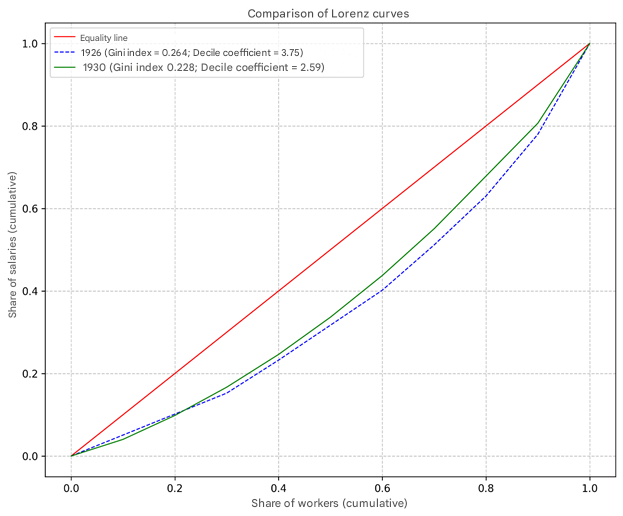 DOI: 10.7256/2585-7797.2025.4.77592EDN: SEXGRSReceived: 12/31/2025Published: 01/07/2026Abstract: The article is devoted to studying the dynamics of wage differentiation among industrial workers in the USSR during the first two five-year plans. The primary focus is on analyzing to what extent the policy of combating "wage leveling" (уравниловка), proclaimed in 1931, led to a real increase in pay inequality. The source base consists of archival documents and statistical publications from the 1920s–1930s. The novelty of the work lies in the comprehensive use of quantitative methods to analyze wage policy at the intersection of two eras – the end of the NEP and forced industrialization – as well as in verifying the thesis of the "struggle against wage leveling" using specific statistical data on industries and regions. The study analyzes wage differentiation indicators in Soviet industry as a whole, in key industries (coal mining, metallurgy), and at the regional level. Statistical tools for measuring inequality are applied: the Gini index and the decile coefficient; Lorenz curves are constructed for visualization. The Appendix to the article describes the methodological problems of working with interval statistical data and proposes an algorithm, developed by the authors in Python, for calculating inequality indicators with varying structures of initial interval data on the distribution of workers by wage level. The results of the analysis lead to the following conclusions: in the late 1920s and early 1930s, the leveling tendency that began during the NEP years generally persisted; at the industry level, a turning point emerged in the early 1930s – wages in priority heavy industry sectors began to grow at an accelerated pace. From a regional perspective, data analysis for the Kuzbass coal industry in 1935 showed a higher level of differentiation compared to the late 1920s, indicating the implementation of a policy related to increasing the role of material incentives for labor. This is also evidenced, in particular, by the dynamics of the wage ratio between highly-skilled and low-skilled workers. Keywords: inequality measurement, wage differentiation, Gini index, Lorenz curve, labor incentives, Soviet industrialization, heavy industry, Five-pYears-Plans, labor productivity, KuzbassThis article is automatically translated. Introduction 2025 marks the centenary of the course of industrialization of the USSR, designated by the XIV Congress of the CPSU (b) In December 1925, who commissioned the preparation of the first five-year plan. The publication of this issue of our journal in December 2025 explains the publication of this article in this issue. The fulfillment of the planned tasks of the first five-year plans during the years of industrialization required an increase in labor productivity in all sectors of the economy. During the first five–year plan (1928-1932), labor productivity in Soviet industry grew at an average rate of 8.2% per year, and in the second five-year plan (1933-1937) - 13.9% (estimated) per year [1]. An important factor in the growth of labor productivity in the process of Soviet industrialization was the material motivation of industrial workers. The problems that emerged in this area during the first five-year plan were discussed at the All-Union Meeting of Business Executives in June 1931, where, in particular, the task was set to "eliminate labor turnover, eliminate equalization, properly organize wages, and improve the living conditions of workers" (from Stalin's speech [2]). As a result of this meeting, intensive work began on the modification of the tariff system by the Supreme Council of National Economy, the All-Russian Union of Industrialists and Entrepreneurs, and the industrial Commissariats in the direction of increasing wage differentiation, taking into account the qualifications of workers and their productivity; the planned increase in wage differences in industries (with heavy industry as a priority); the transfer of a number of working professions to a predominantly piecework form of remuneration, etc. For example, A. K. Sokolov noted that already in the early years of Soviet power, "... the main conflict in the field of labor relations in Soviet times was outlined: the struggle of an equalized and differentiated policy in the field of remuneration for work" [3, p. 178]. To what extent did the measures taken make it possible to move away from the "equalization" characteristic of the NEP period and increase the differentiation of the actual wages of industrial workers in the first five-year plan and at the beginning of the second? This task was set by the government in 1931 in order to increase the incentive for more productive work. In this paper, the task is to identify sources for measuring wage differentiation in the Soviet industry as a whole and in individual sectors, as well as to analyze such indicators. The regional aspect is also of interest. In this regard, we will turn to the sources of remuneration in the Siberian industry during the first two five-year plans. Data and methods The most accurate estimates of differentiation can be obtained in cases where sources make it possible to use the Gini index based on the distribution of employees across salary intervals, indicating the appropriate number (or proportion) of employees in each interval. The Gini index takes values from 0 to 1; the closer its value is to 1, the higher the degree of inequality. Visualization of such distributions is based on the construction of the Lorentz curve. If the source makes it possible to estimate the share of employees only in the upper and lower ranges, a decile coefficient can be used as an estimate of the degree of differentiation, which shows the ratio of total income in the upper and lower ten percent groups. The characteristics of these meters, taking into account the specifics of the statistical sources used in our study, are given i