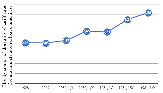 Source: [19, pp. 330-331, Table 8]. A comparison of the data in Tables 7 and 6 shows that in 1935, the degree of wage differentiation among workers in the Kuzbass coal industry was noticeably higher than the values of the corresponding indicators calculated for industrial workers in the Siberian Region in the late 1920s. This is confirmed by our calculation of the ratio of wages of workers in one of the most highly paid professions related to coal mining – miners – to coal industry laborers. In 1928-1929, the monthly earnings of a slaughterer exceeded the earnings of a laborer by 1.39–2.50 times (according to the materials of the Anzhero-Sudzhensky district, Kemerovo and Leninsky mines (calculated according to [22, p. 30, Table 14;]). In 1934, this ratio was 2.96 for the entire coal industry in Western Siberia. According to the ratio of average hourly earnings at the same time, manual slaughterers (manual slaughterers are slaughterers who did not use jackhammers. – the term from the source) were ahead of the laborers by 3.51 times. Thus, it can be concluded that the ratio of salaries of high- and low-skilled workers, having significantly decreased by the end of the 1920s, increased markedly by the mid-1930s (calculated according to: [19, pp. 328-329, Table 7.]). These comparisons reflect the results of the restructuring of the wage system in the coal industry, initiated by Stalin's speech at the high-profile All-Union Meeting of Business Executives in June 1931. Already on July 7 of the same year, the appeal of the Council of People's Commissars of the USSR, the Central Committee of the CPSU(b) and the Supreme Economic Council of the USSR to all party, Soviet-economic, trade union and Komsomol organizations "On the tasks of the Donbass coal industry" was adopted, which noted: "To the Coal Association and the Central Committee of the Union of Coal Workers within a 2-month period to completely eliminate wage equalization and introduce such forms of remuneration that would provide significant advantages for leading qualifications, stimulate increased productivity and work experience" (https://istmat.org/node/52005 ). On September 10, 1931, at a meeting of the Politburo of the Central Committee of the CPSU(b), a resolution was adopted "On restructuring the wage system in metallurgy and the coal industry" (https://istmat.org/node/53603 ), which emphasized that "the wage system does not fulfill its role as a powerful lever for increasing labor productivity." It also stated that the current tariff schedule should be changed by introducing 11 tariff rates instead of 27 for the entire Donbass coal industry. As a result, the difference in tariff rates for high-skilled and low-skilled workers was adjusted to create more effective incentives for productive, skilled labor. On April 8, 1933, the Decree of the Council of People's Commissars of the USSR and the Central Committee of the CPSU(b) "On the work of the Donbass coal Industry" was published, which, in particular, set the task of eliminating equalization in the wage system in the industry, which required "providing higher wages for underground workers compared with above-ground workers" (https://istmat.org/node/58831 ). It should be noted that although the above-mentioned documents of the governing bodies related to the state of affairs and tasks of the Donbass industry, they were considered as guidelines for decision-making by the party and economic bodies of Kuzbass. Thus, in October 1930, there was a significant increase in the salaries of coal miners (by 19%), which was "a direct consequence of the implementation of the conclusions and decisions of the Government Commission that had completed its work in Donbass by that time" by V. M. Molotov [23, p.205]. At the same time, "the leading underground professions and, mainly, those related to mechanization" were highlighted. Characteristically, the rates of skilled workers, for example, machinists, were increased by 27%, while those of surface handlers were increased by 4%. In addition, instead of the twelve-digit tariff grid used at that time in Kuzbass, a ten-digit grid was introduced [23, p. 205]. Finally, in connection with the implementation of the above-mentioned decree "On restructuring the wage system in metallurgy and the coal industry" in Kuzbass, from October 1, 1931, another salary increase was carried out by an average of almost a quarter. Thus, "in essence, the beginning was laid for the elimination of wage equalization" [23, p. 205]. Table 8. Evolution of wage rates for workers